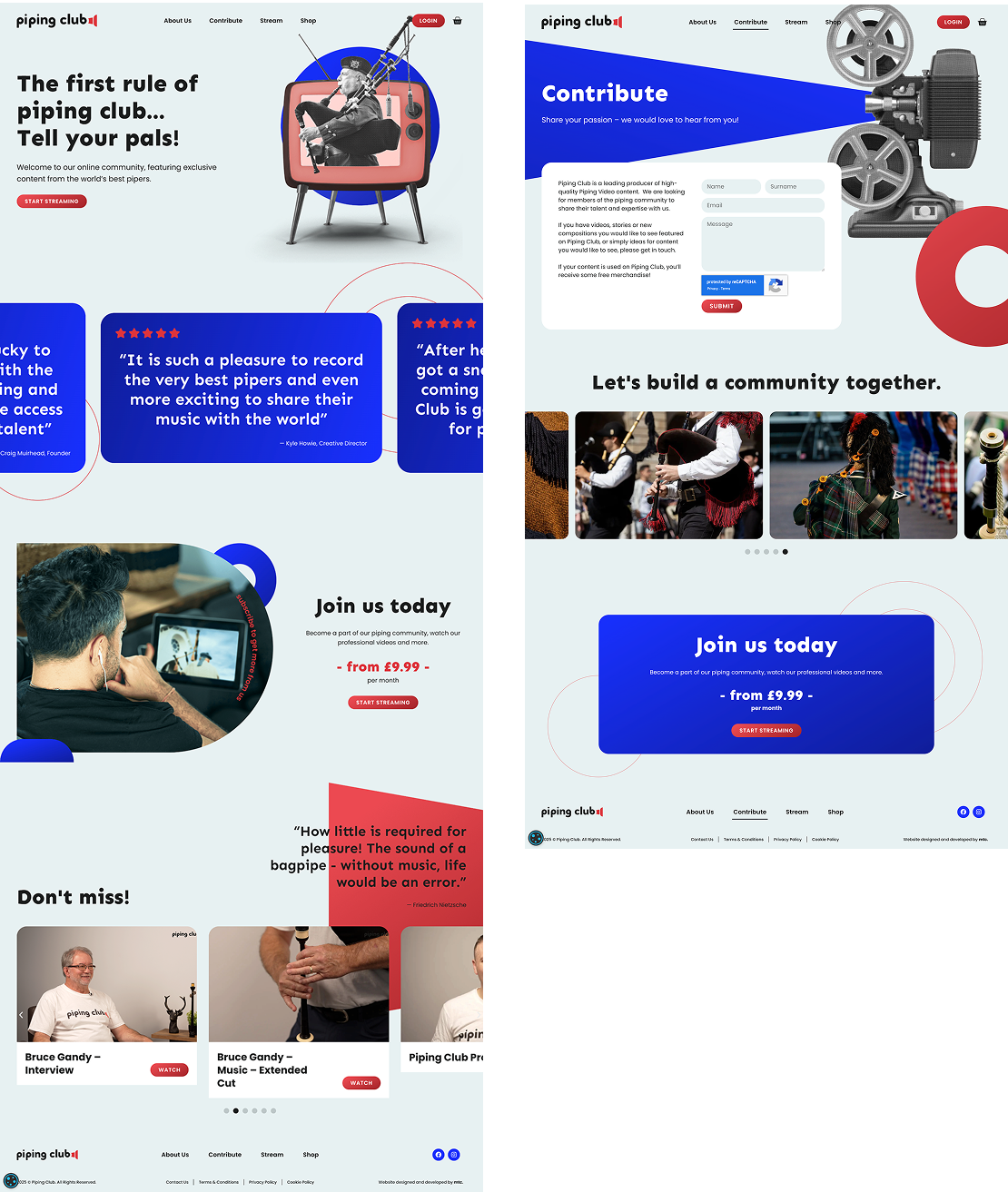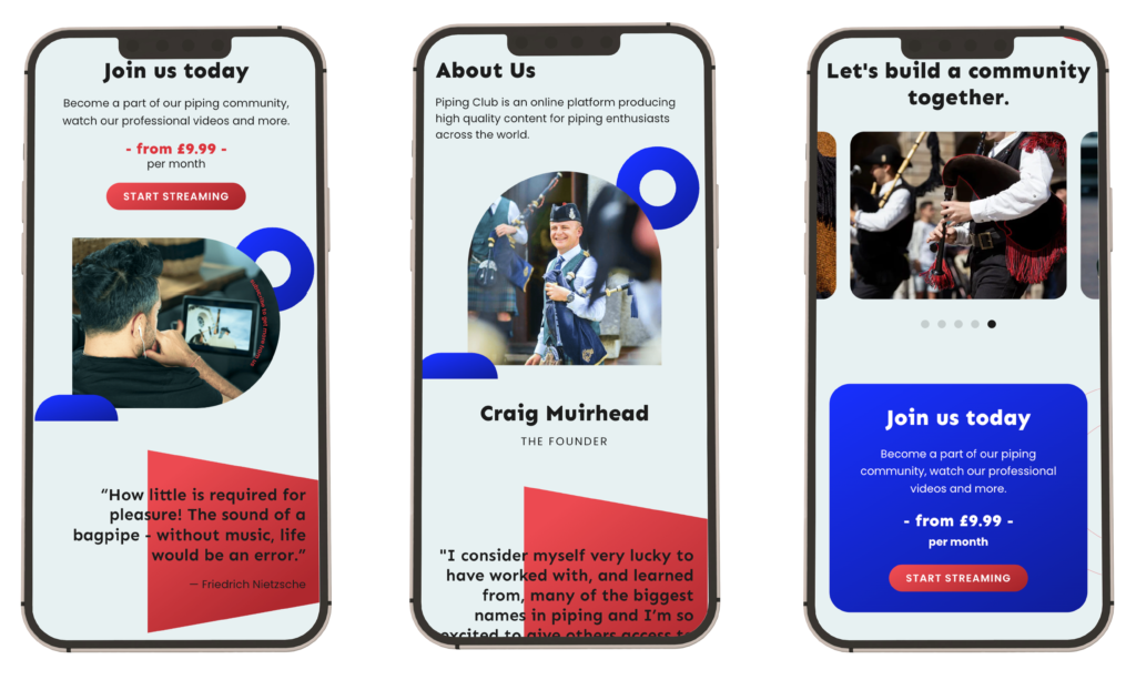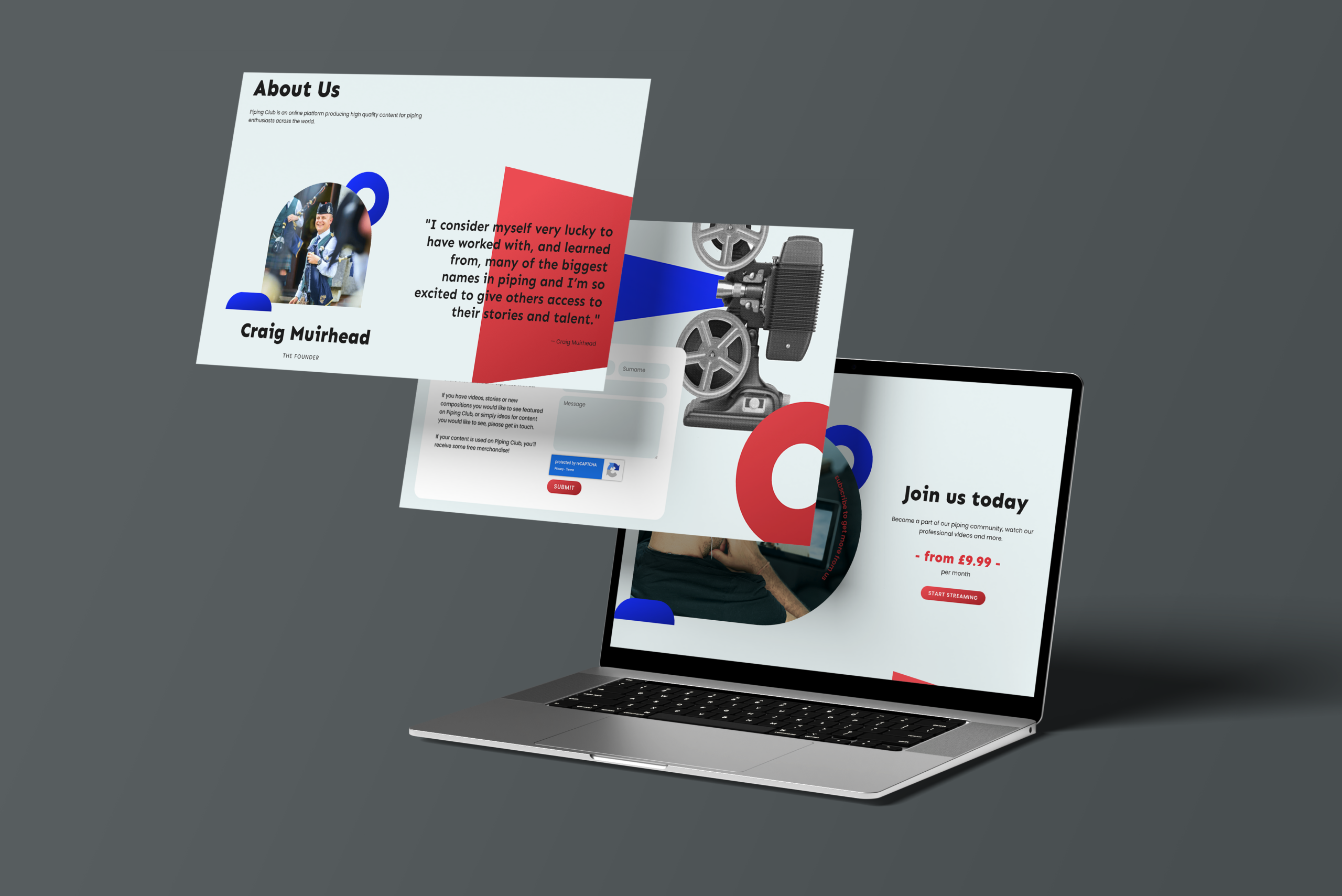 The primary goal was to create a platform where members could easily sign up, manage their accounts, and access exclusive piping content, including instructional music videos and downloadable resources that would be updated on a monthly basis. Usability and clarity were key priorities, particularly around the registration process and the user account area.
